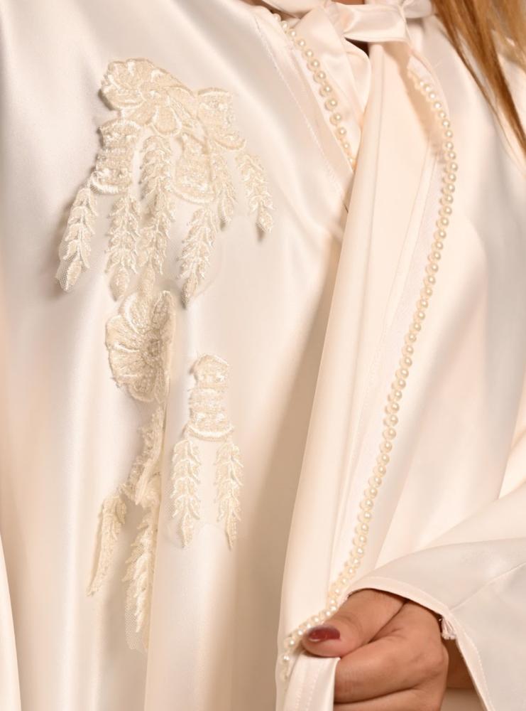 • تتميز هذه العباءة بأنها واسعة وذات تفاصيل بسيطة وأنيقة، وذات خامة ناعمة ومريحة للبشرة، مما يضفي على العروس شعوراً بالراحة والجمال.